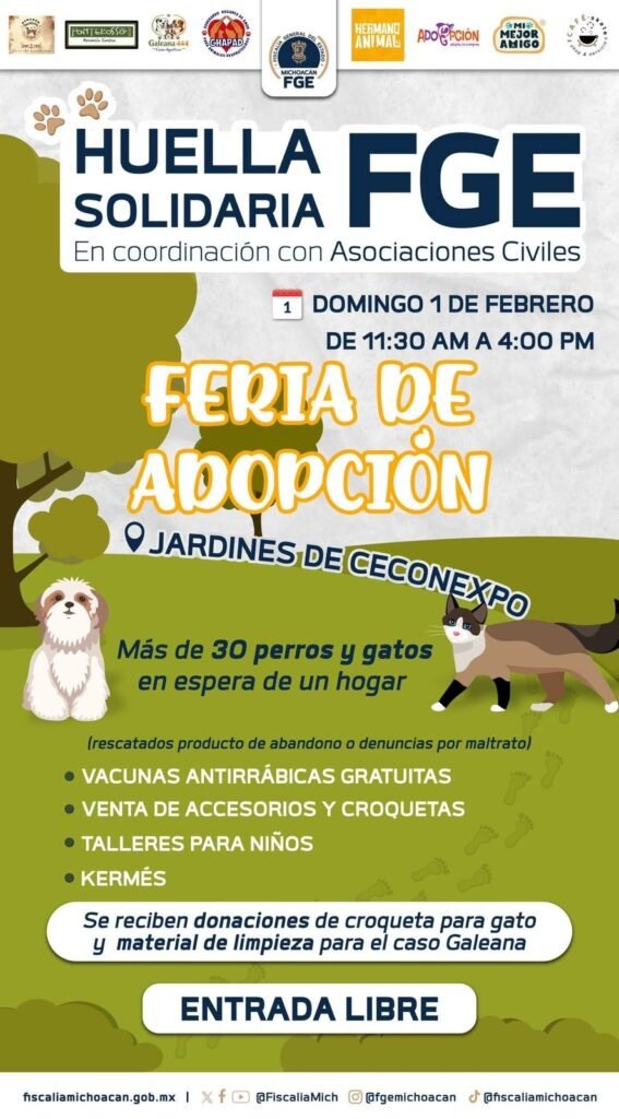 Morelia, Michoacán, a 30 de enero de 2026.- La Fiscalía General del Estado de Michoacán (FGE), en coordinación con diversas asociaciones civiles dedicadas a la protección y bienestar animal invita a la ciudadanía a participar en la Feria de Adopción “Huella Solidaria”, una actividad que tiene como propósito principal fomentar la adopción responsable, fortalecer la cultura del respto hacia los seres sintientes y promover la participación sociales en acciones que contribuyen a la reconstrucción del tejido comunitario.